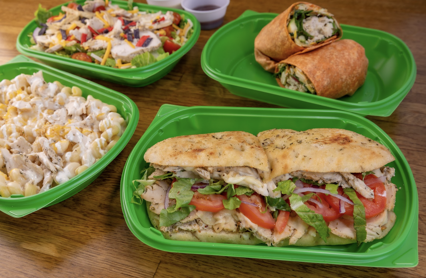 Package includes: - Assortment of Chicken Caesar, Spicy Chicken Bacon & BBQ Ranch Chicken wraps (10 cut in 1/2) - Medium Kale Chicken Caesar Salad & Medium BBQ Ranch Chicken Salad - Medium Chicken Ranch Mac & Cheese Tray