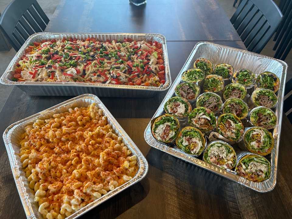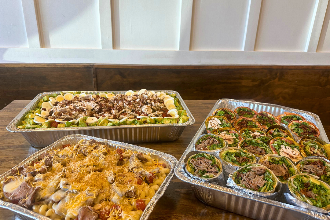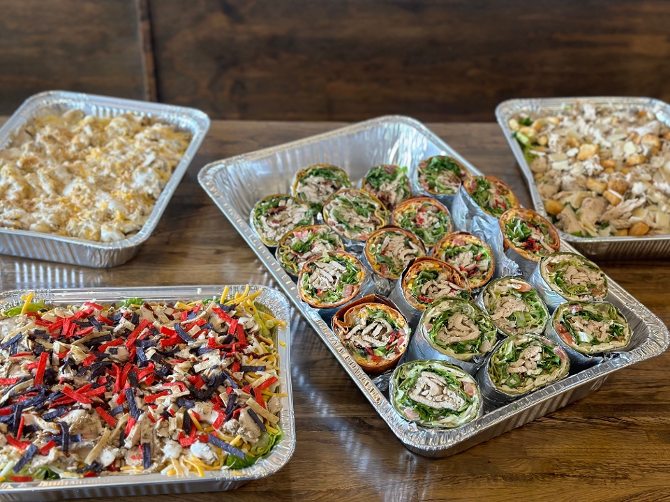 Package includes: - Assortment of Tri Tip & Bacon, BLT & Spicy Chicken Bacon wraps (10 cut in 1/2) - Large Chicken Cobb Salad - Medium Four Cheese Steak Mac & Cheese Tray
