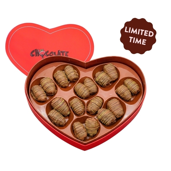A beautiful heart-shaped box filled with our signature Dubai Dates — premium dates stuffed with crispy knafeh and pistachio cream, dipped in milk chocolate and finished with a pistachio-chocolate drizzle. The perfect sweet gift for Ramadan, anniversaries, Valentine’s, or any special moment worth celebrating.