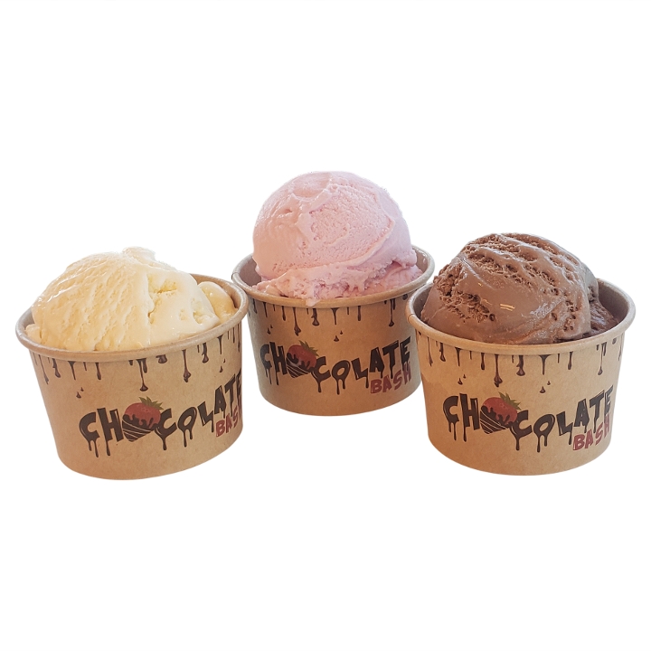 three layers of vanilla ice-cream, rice krispies and melted warm Belgium chocolate