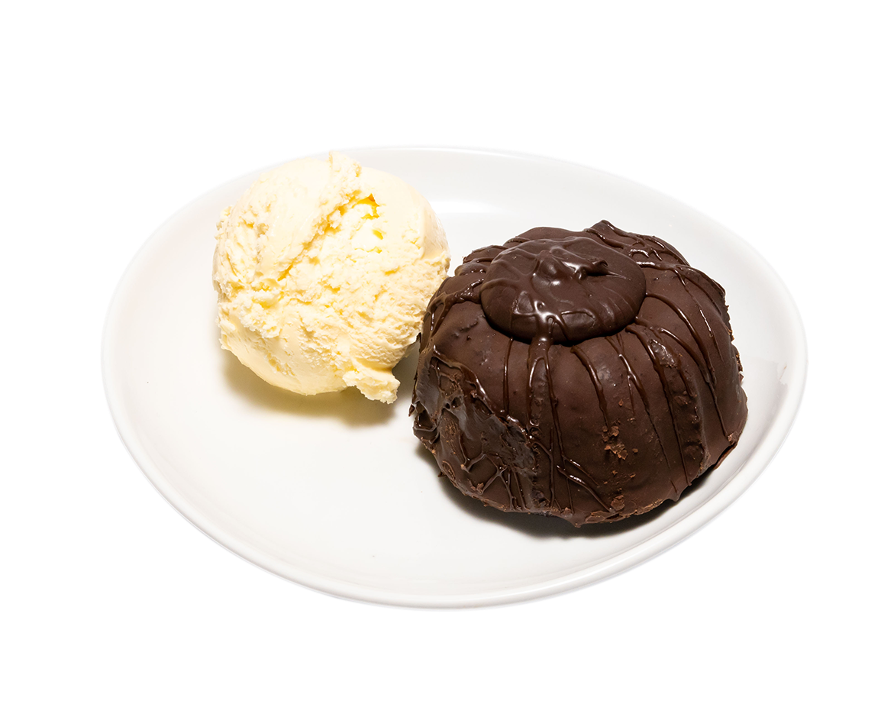 warm chocolate cake with a molten chocolate center, topped with vanilla ice-cream