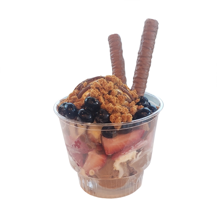 Indulge in our Banana Cup – a delicious treat featuring fresh banana slices topped with warm, rich Belgian chocolate.