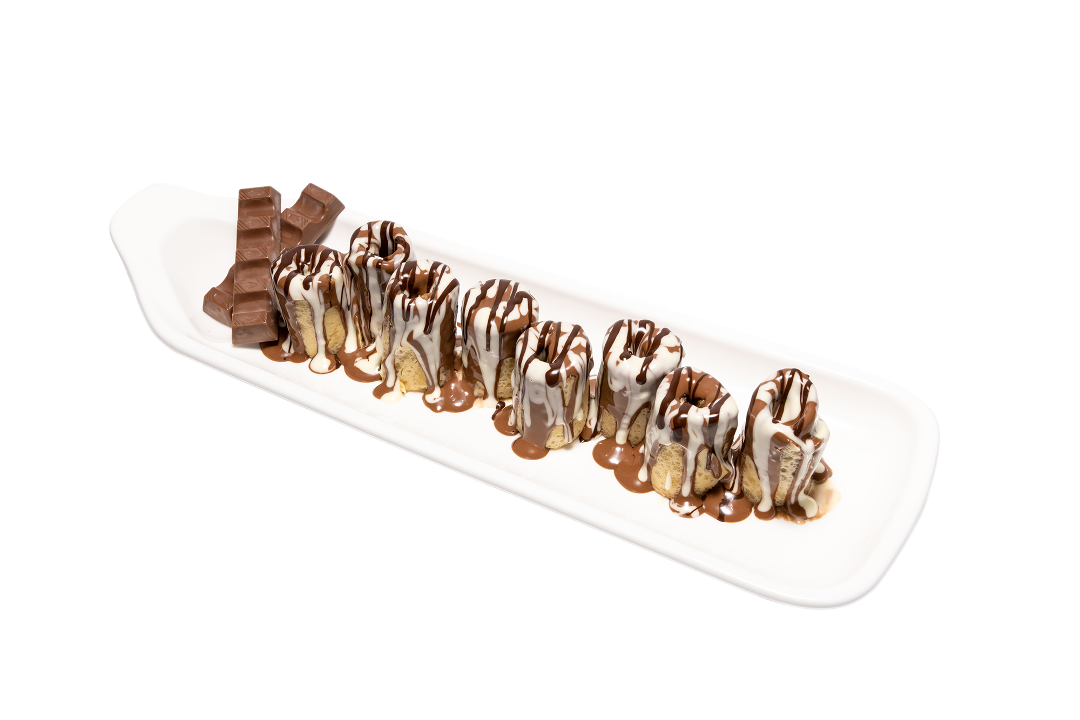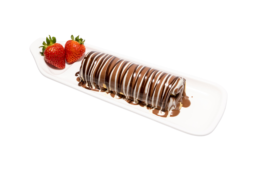 sushi style crepe wrapped in Kinder chocolate, topped with Belgium chocolate and European cookies