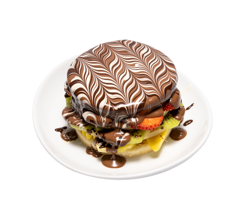 crepe rolled with your choice of 2 fruits, topped with Belgium chocolate