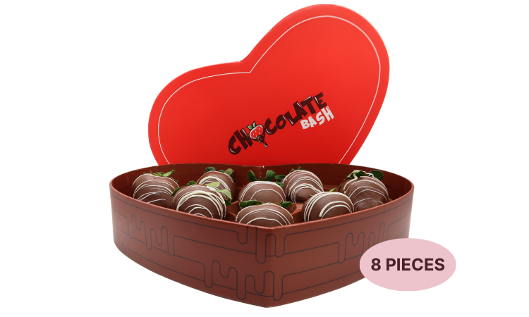 8 Chocolate Covered Strawberries on Belgian Chocolate in our Signature Heart Shape Gift Box