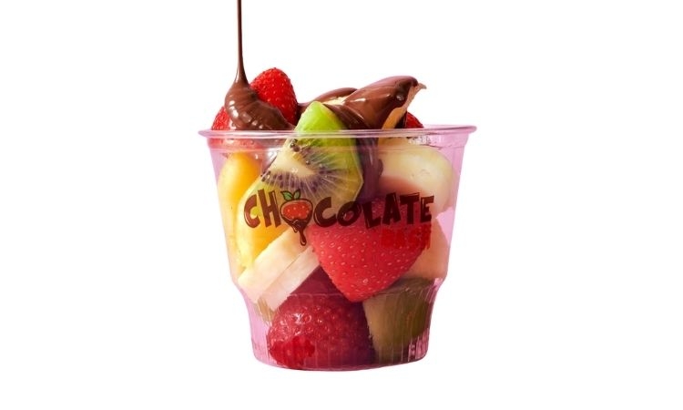 A colorful assortment of fresh seasonal fruits served with a warm, velvety chocolate dipping cup.