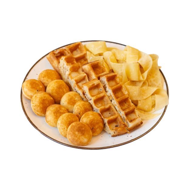 Mix of Mini Pancakes and bite pieces of Waffles (105 pcs) with 4 dipping sauce options.