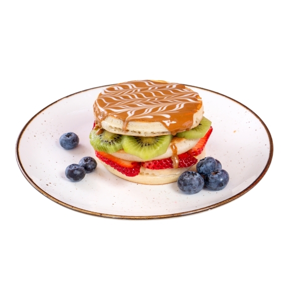 3 pancakes layered with your 2 choices of fruit and served with your choice of topping