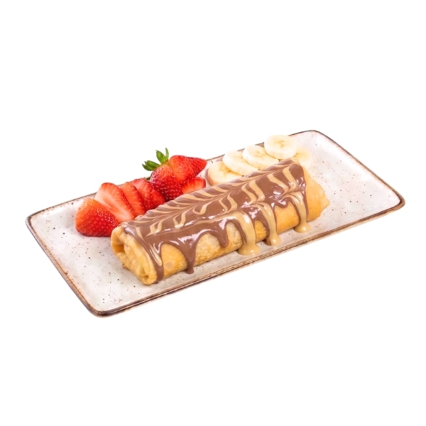 A crepe rolled and filled with your choice of 2 fruits, topped with Belgian chocolate and toppings of your choice.