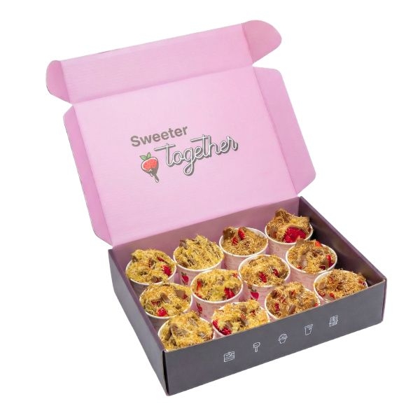 Indulge in our signature Dubai Cups, beautifully crafted for sharing. This catering box includes 12 (4 oz) cups made with fresh strawberries and premium toppings, featuring two delicious varieties: 6 Cups: Belgian milk chocolate, Italian pistachio, and crispy knafeh 6 Cups: Cookie butter, Belgian chocolate, and crispy knafeh A perfect balance of rich, crunchy, and sweet flavors, ideal for events, gatherings, or gifting.