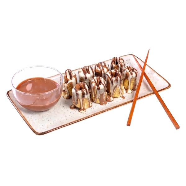 Sushi-style: Chocolate bar wrapped around a rich crepe and drizzled with warm Belgian chocolate.