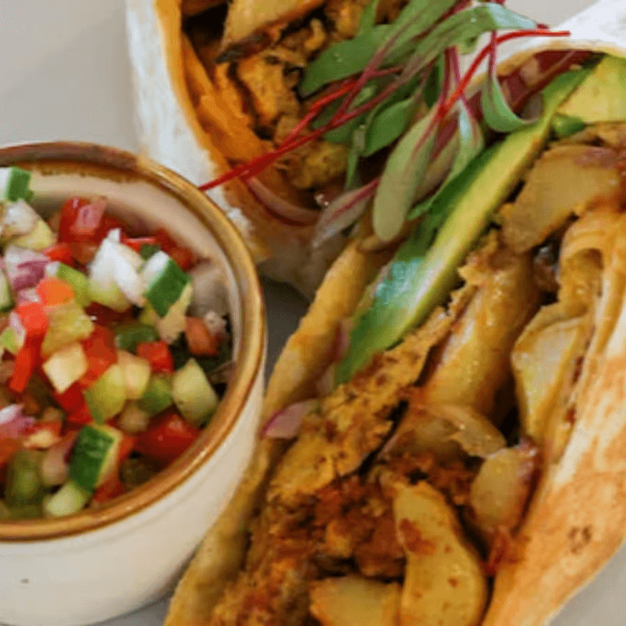 Scrambled eggs, chorizo, cheddar cheese, potatoes, and salsa wrapped in a flour tortilla