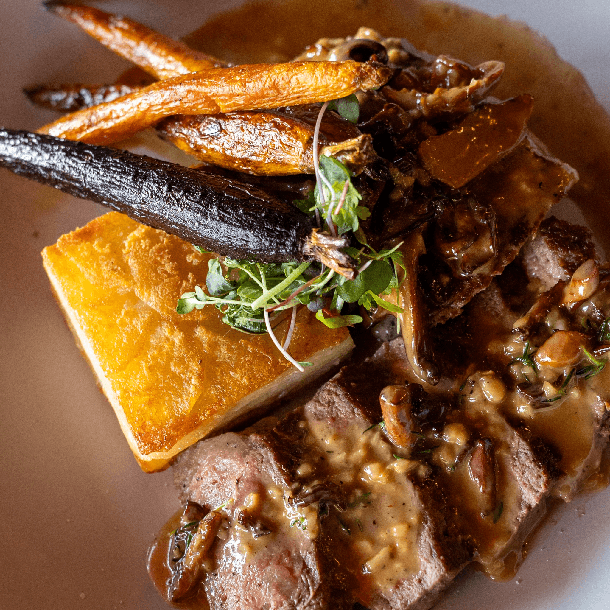 6 oz New York steak, sautéed mushrooms, onion and mayo on a ciabatta roll