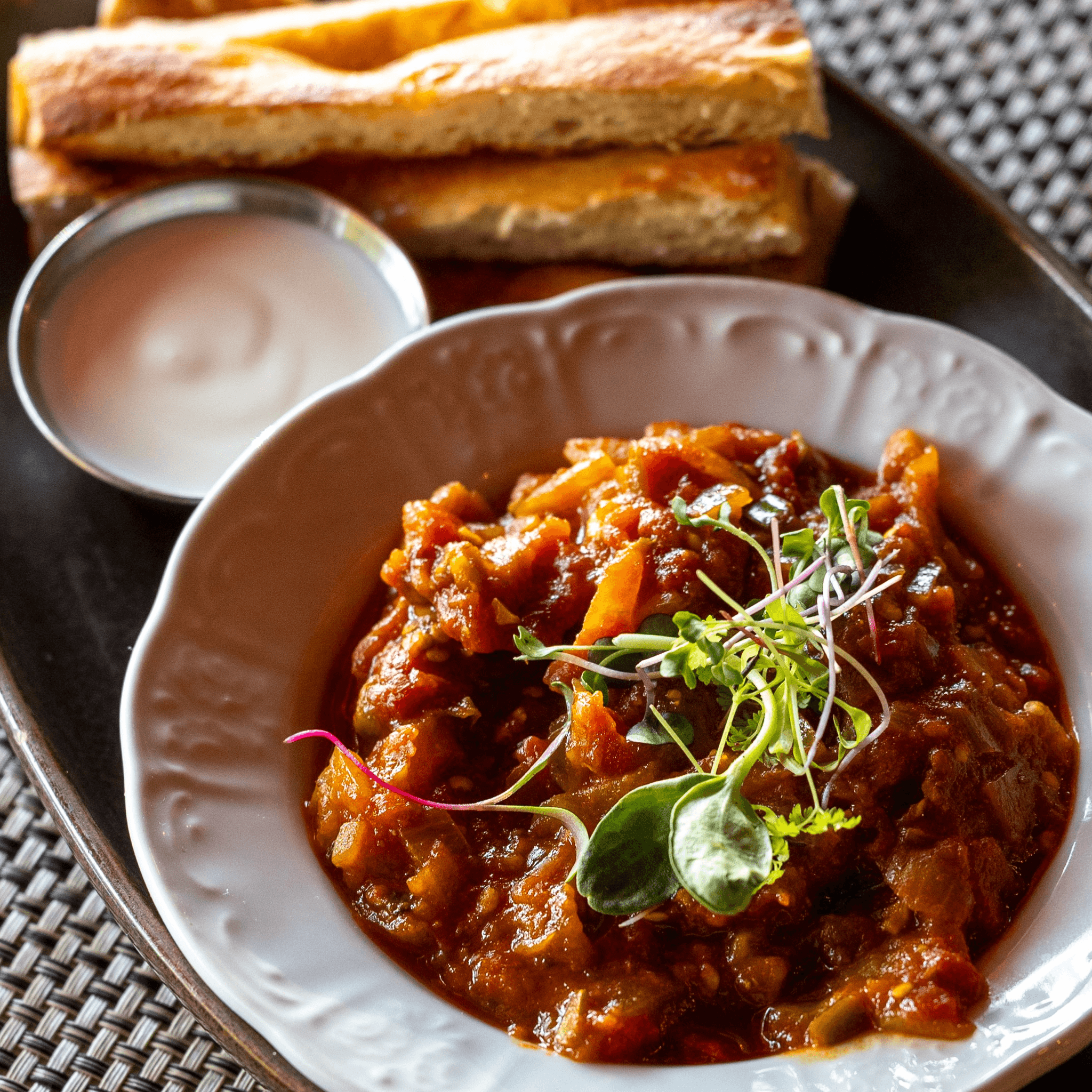 Eggplant fried with tomato, garlic, and Afghan sauce, served with bread