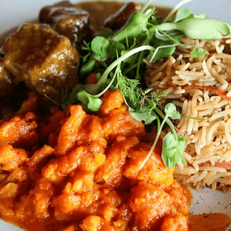 Special rice topped with almonds, raisins, and carrots, flavored with cardamon. Served with beef shoulder cut and sautéed cauliflower
