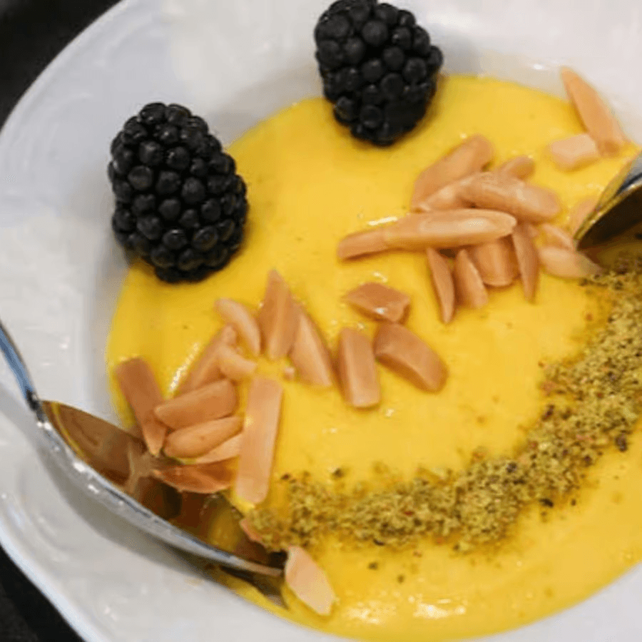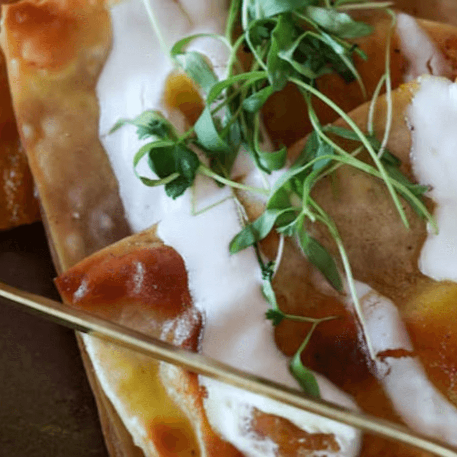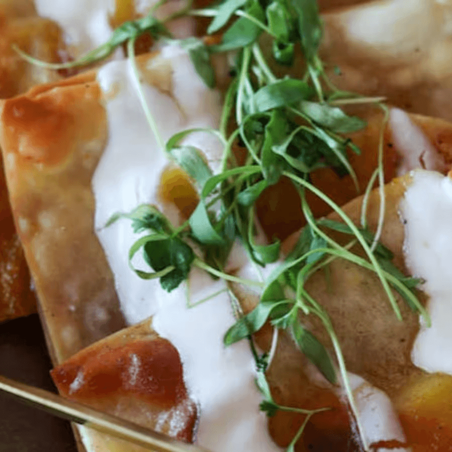 Grilled crispy phyllo dough filled with shredded butternut squash, ginger, garlic, mild cayenne pepper, coriander and black pepper