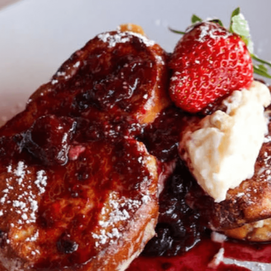 Egg and cream soaked challah bread, butter fried, with raisins, sour cream, sugar, rum, and berry sauce