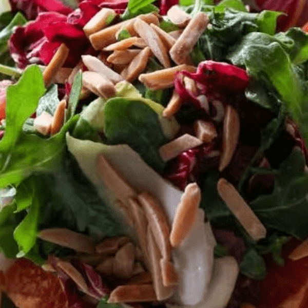 Mixed greens, mix of gold and red beets, red onion, goat cheese, opples and walnuts tossed in an apple cider vinaigrette