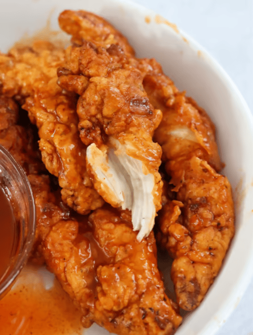 Crispy chicken tenders coated in a spicy honey glaze, served in a small portion size