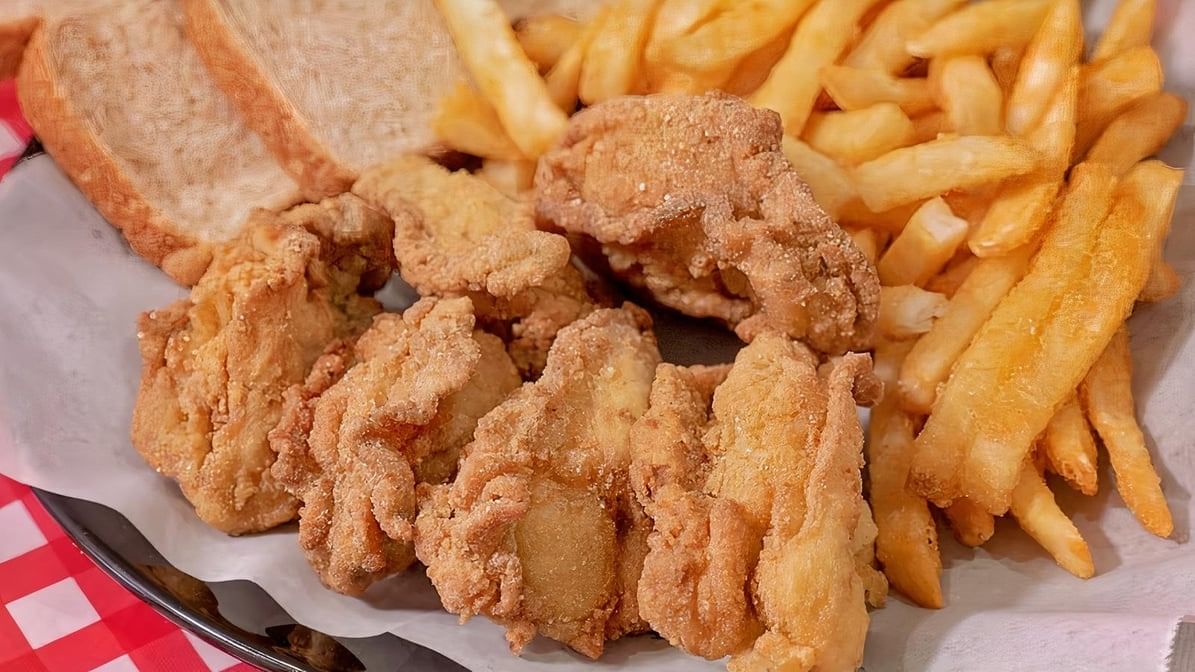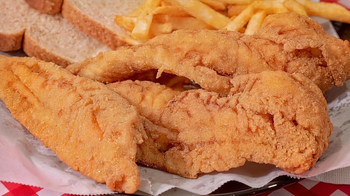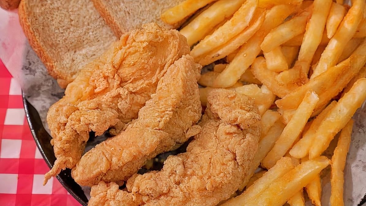 5 real chicken tenders (not cut-up breast meat), fried in our special batter and served with our signature French fries.