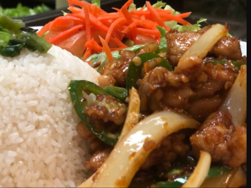Shaken cubed New York steak beef, tossed on a flaming hot wok with onion, scallion in special sauce over rice with a side salad