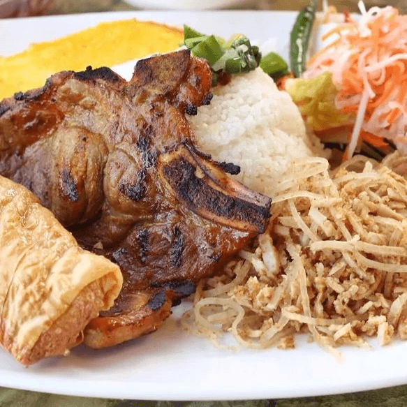 Grilled pork, egg rolls, pork patty, shrimp with rice noodles on a bed of lettuce, cucumber, fried shallots & peanuts.
