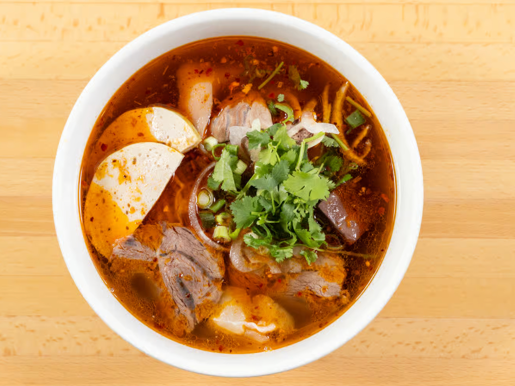 Sliced eye round, beef meatballs, tripe, brisket and tendon in a rich spicy lemongrass beef broth with rice noodles.