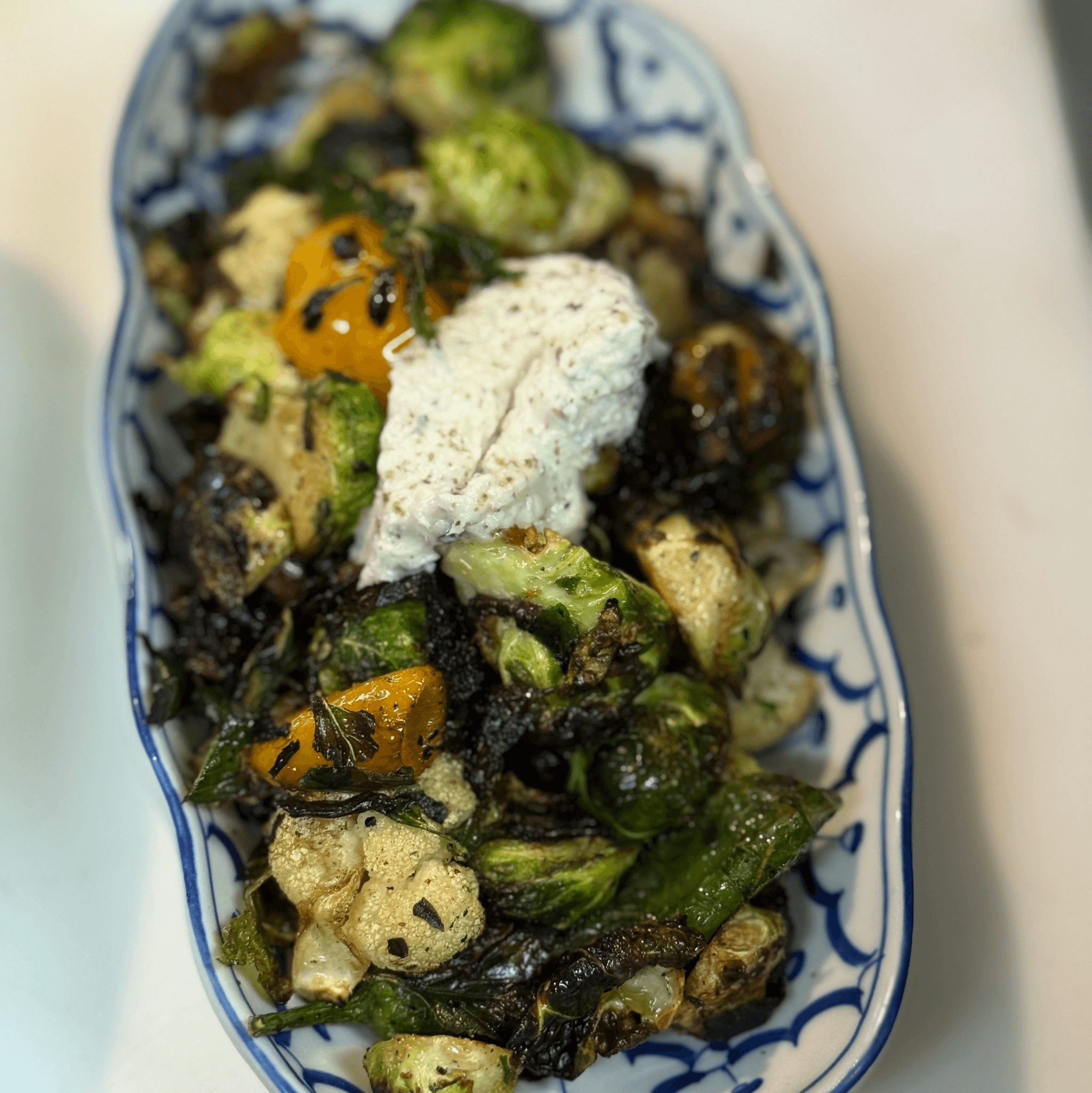 Fried brusselsprouts and shishito peppers tossed in spicy garlic ginger soy sauce with Thai basil. Topped with coconut mint yogurt. (V) (GF)