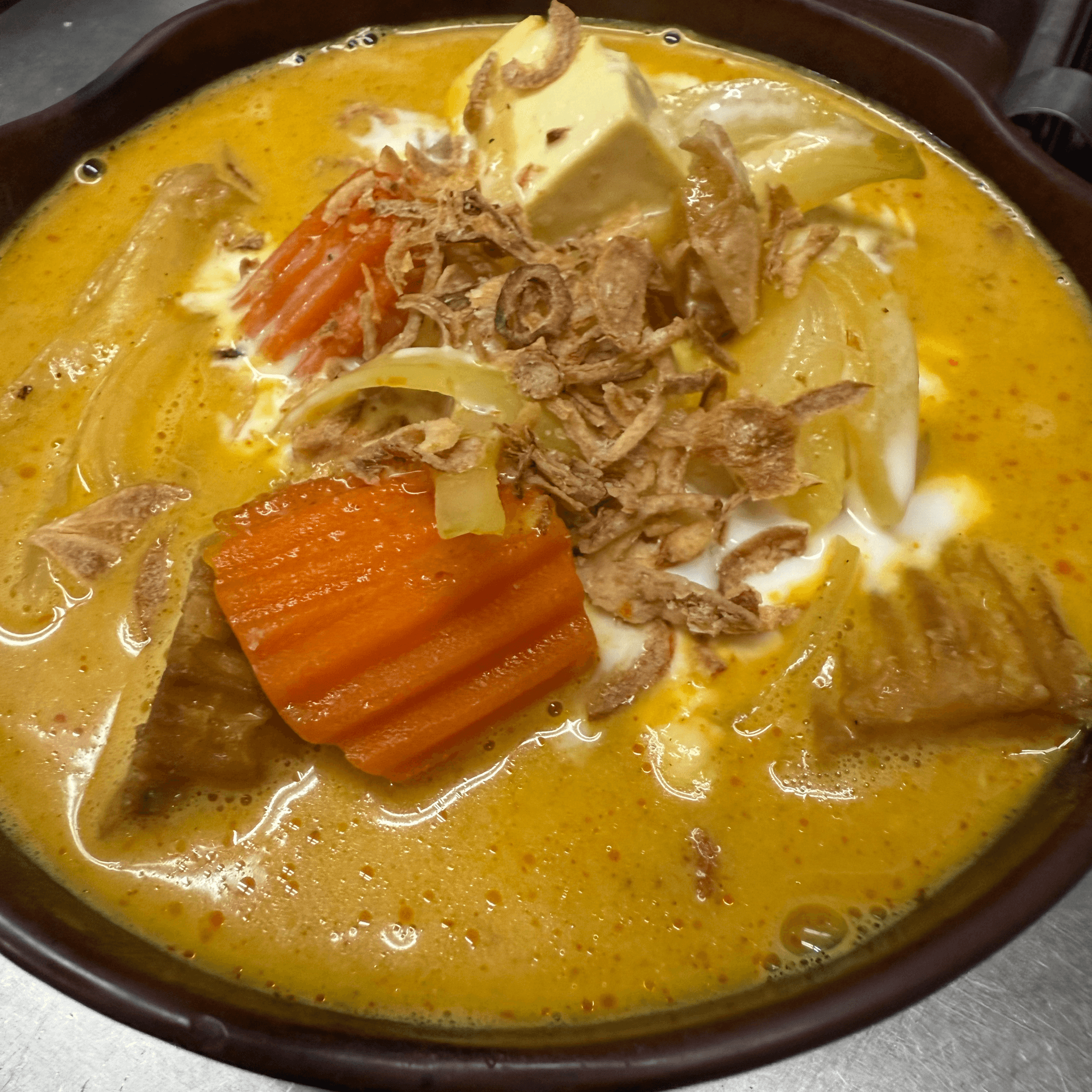 Chicken broth based yellow curry and coconut milk with potatoes, onions and carrots. Jasmine rice (GF) Not available for Vegan.
