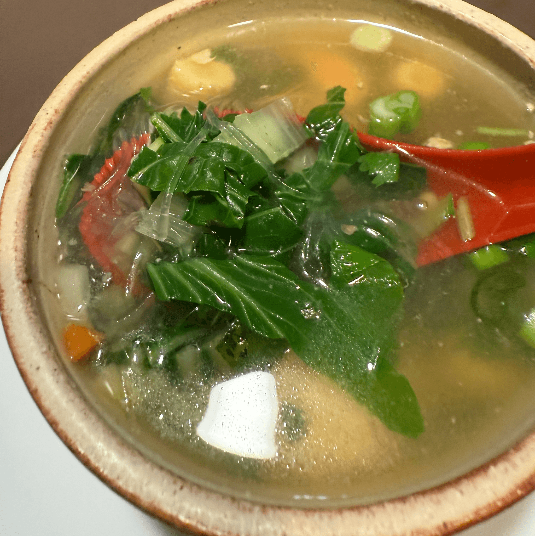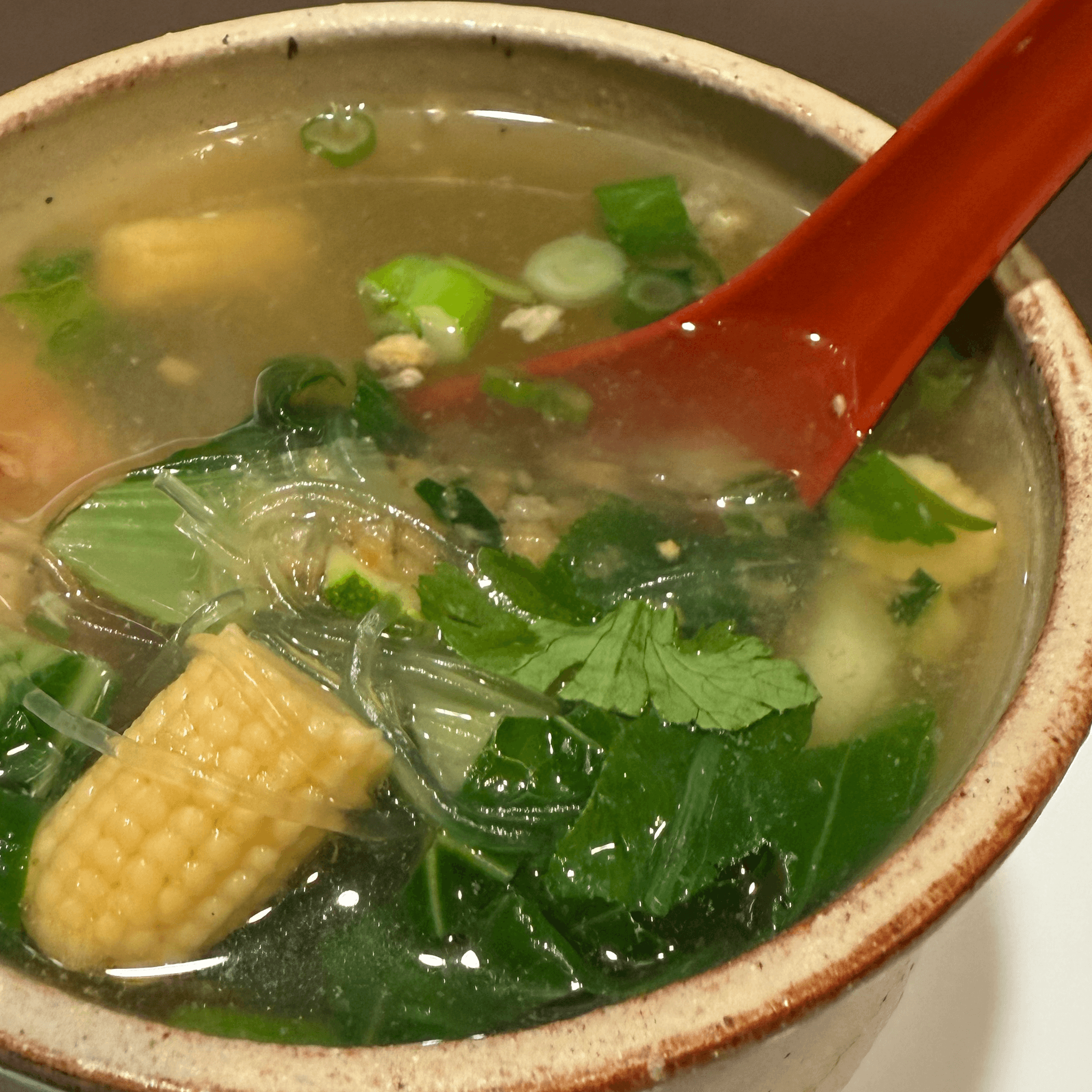 Clear bean-thread noodles with vegetables in clear chicken or veggie broth. Please specifiy for (V) (GF)