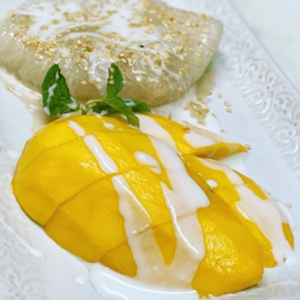 Fresh sliced mango with warm sweet rice in coconut milk. (V) (GF)