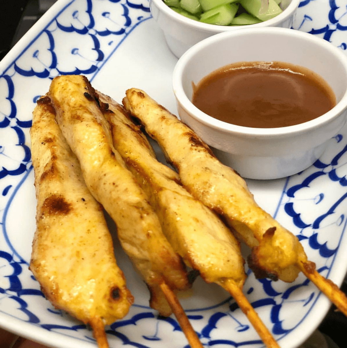 Grilled skewers of marinated chicke breast in creamy yellow cury. Served with a side of peanut sauce and cucumber sauce.