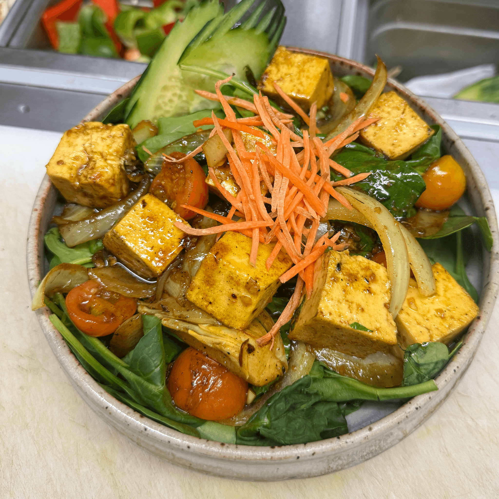 Sauteed tofu in mild yellow curry with tomatoes, onions, lemongrass, cilantro and fresh Thai herbs. Served over a bed of baby spinach with peanut dressing and roasted peanuts. (V)