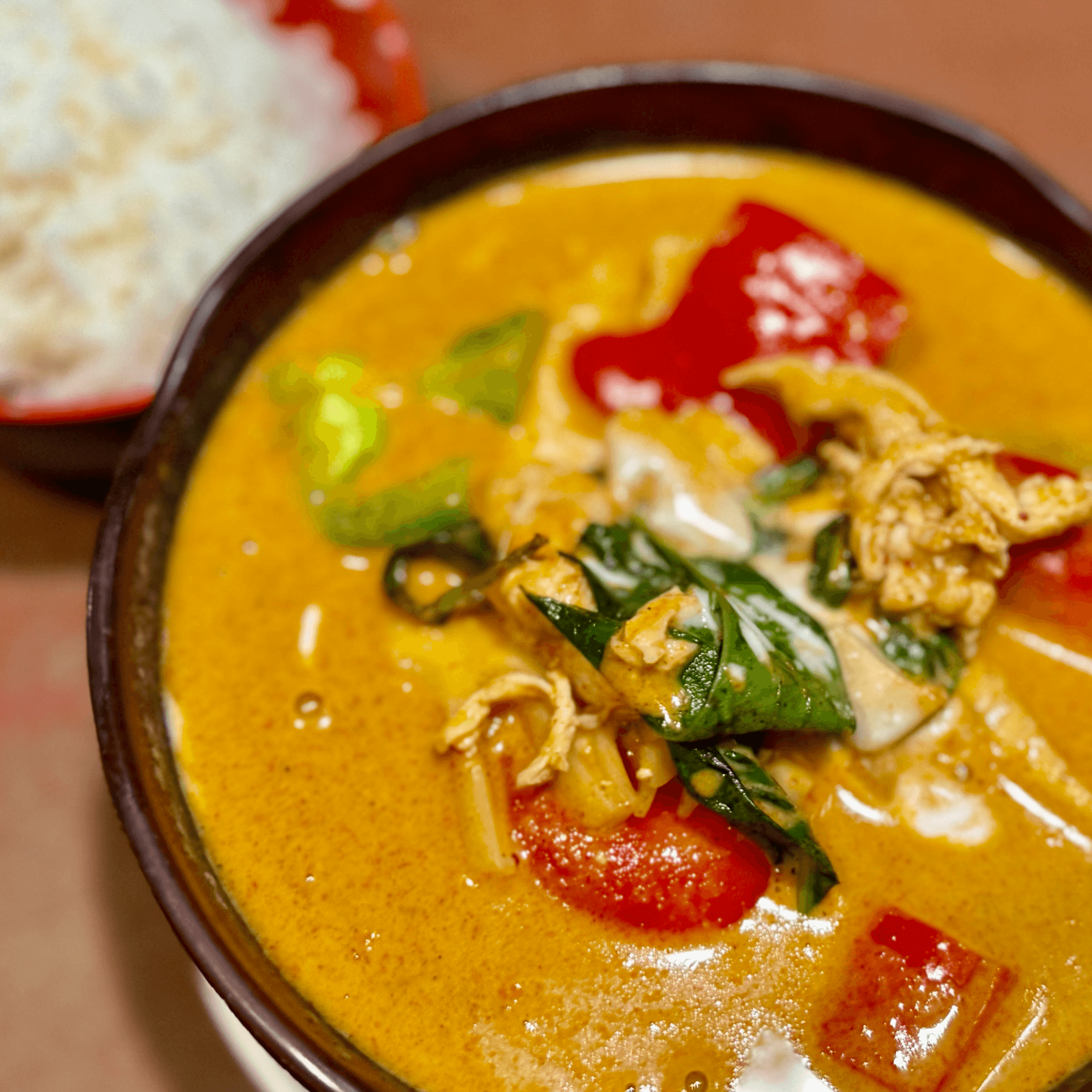 Red curry and coconut milk broth with bamboo shoots, bell peppers, and Thai basil. Jasmine rice (GF)