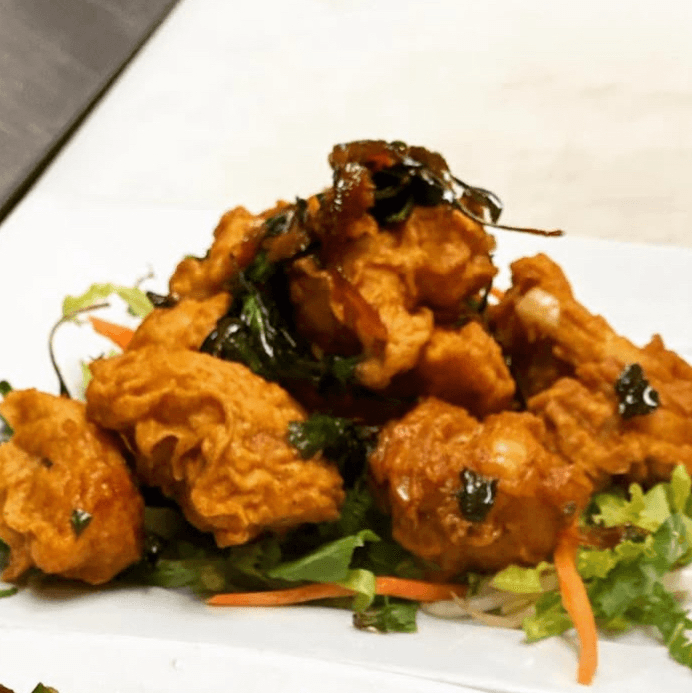Crispy fried chicken nuggets breaded in rice flour batter, tossed in spicy curry oil with herbs and Thai basil. (GF)