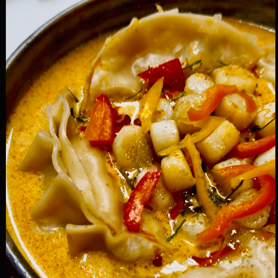 Steamed house made dumplings filled with seafood and Thai herbs in mild curry. Served in tangy creamy curry sauce with bay scallops, sweet peppers, steamed cabbage, kiffer lime oil.