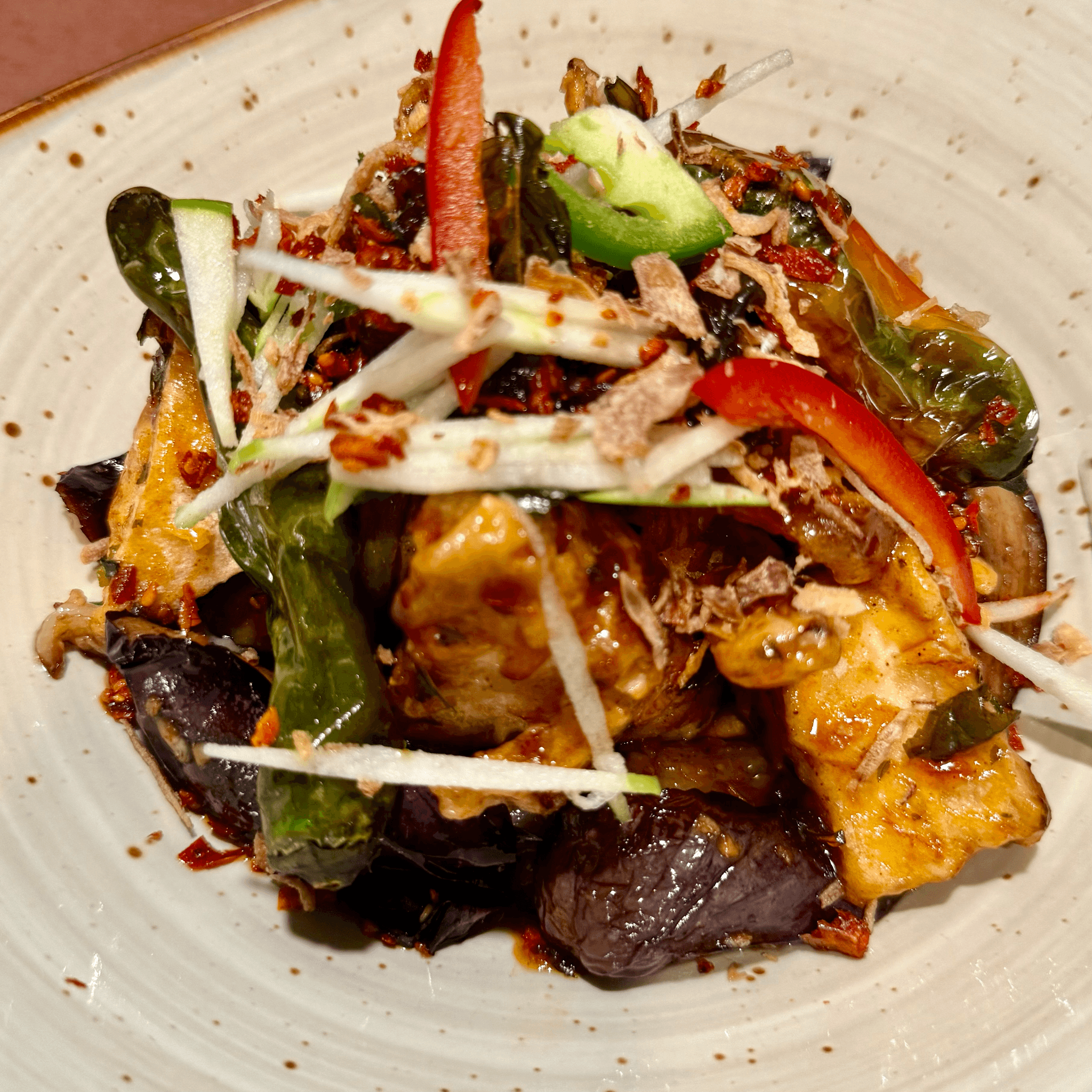 Golden fried breaded tofu sauteed in house-made tamarind sauce with asian eggplants, sweet peppers and cripsy shallots. Served with jasmine rice. (GF) (V)
