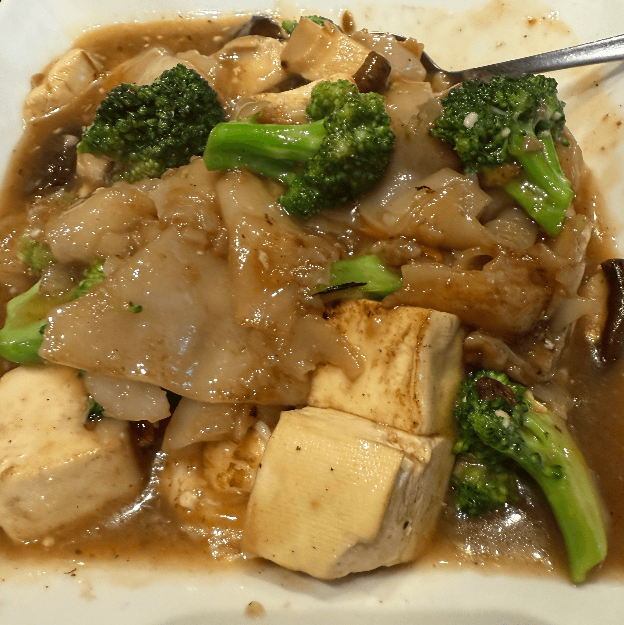 Wok-fried fresh flat rice noodles, egg and broccoli florets in a sweet soy sauce.