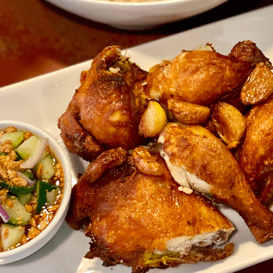 Crispy fried Cornish hen marinated in mild yellow curry & Thai herbs. Served with cucumber salad in sweet & sour sauce. Jasmine rice