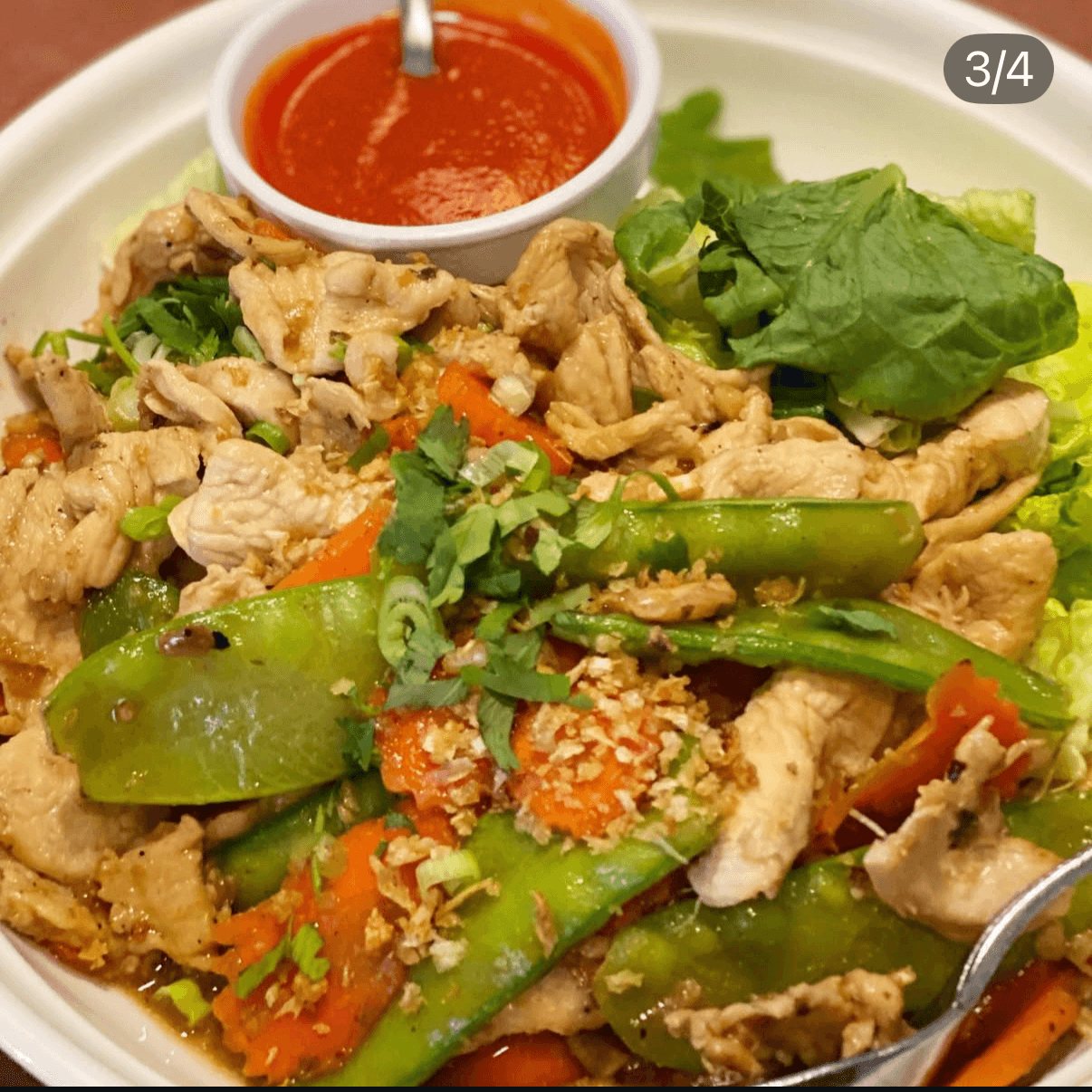 Thai Scampi: Choice of meat with carrots and snow peas pan-fried in mild garlic-pepper soy sauce. Served with fresh lettuce and sweet chili sauce. Jasmine Rice (GF not available)