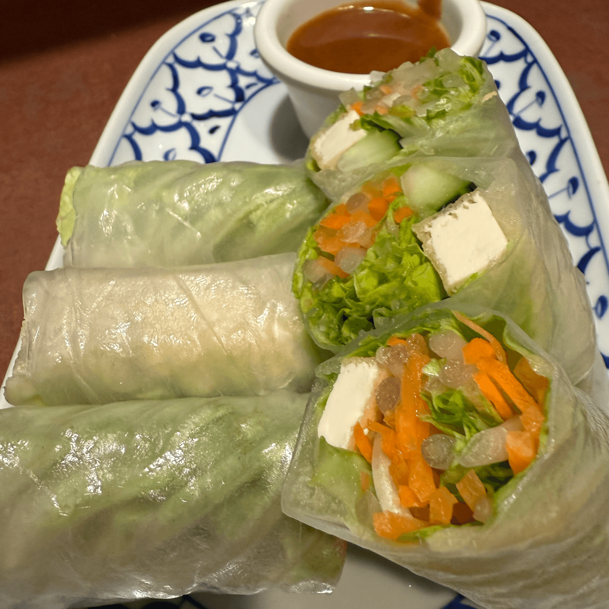 Soft rice paper wrappers filled with tofu, cucumber, rice noodles and mixed lettuce. Served with peanut sauce or house savory fish sauce with roasted peanuts. (V) (GF)