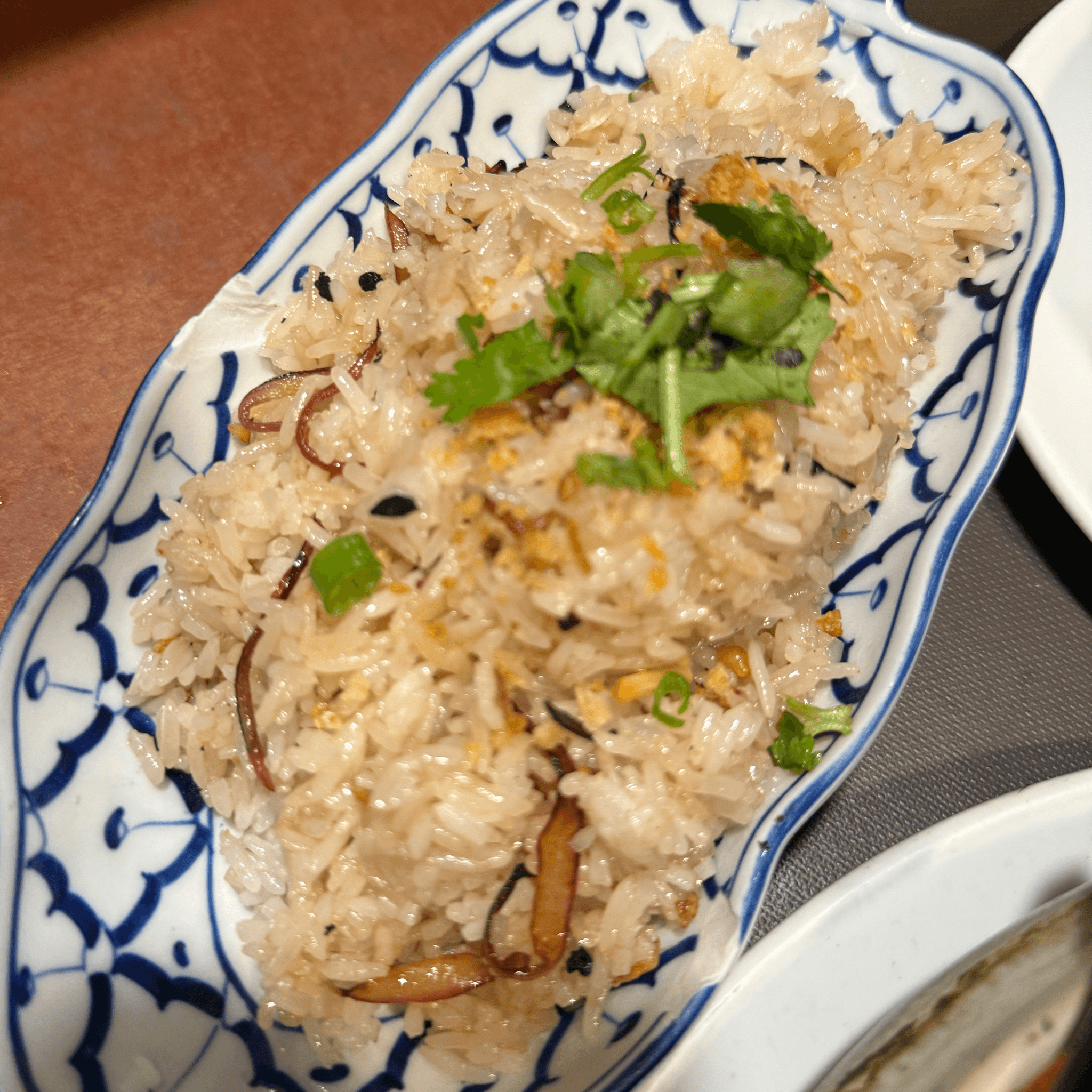 Thai fried jasmine and brown rice in light garlic soy sauce with egg and onions.