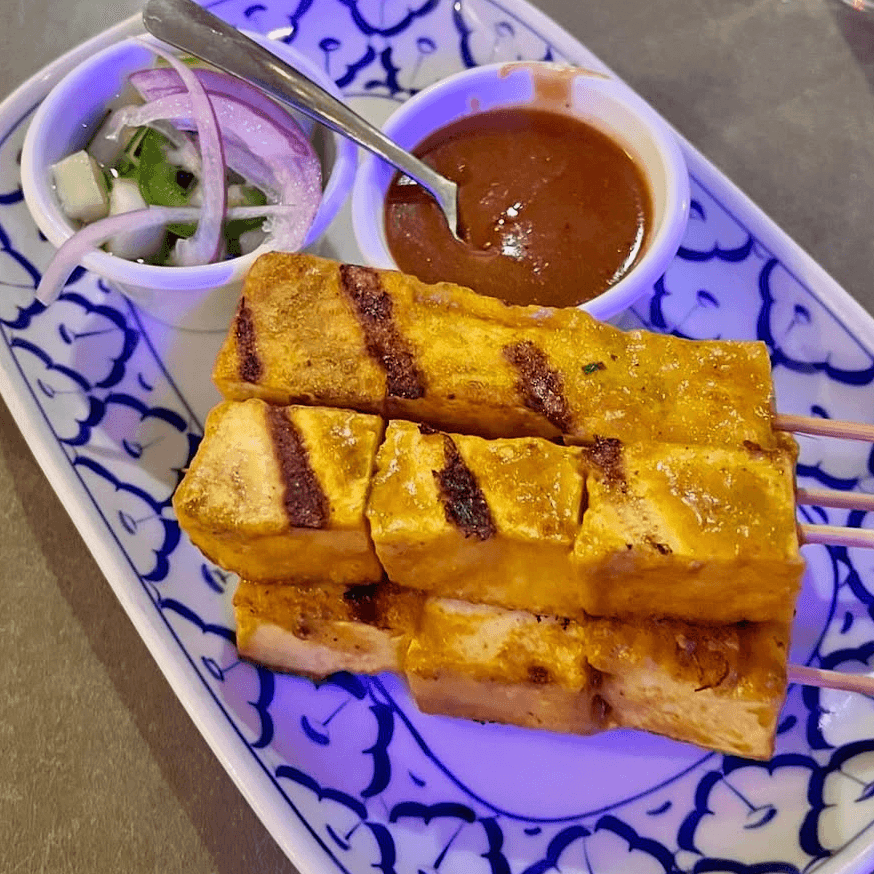 Grilled skewers of tofu marinated in a creamy yellow curry. Served with a side of peanut sauce and cucumber salad.