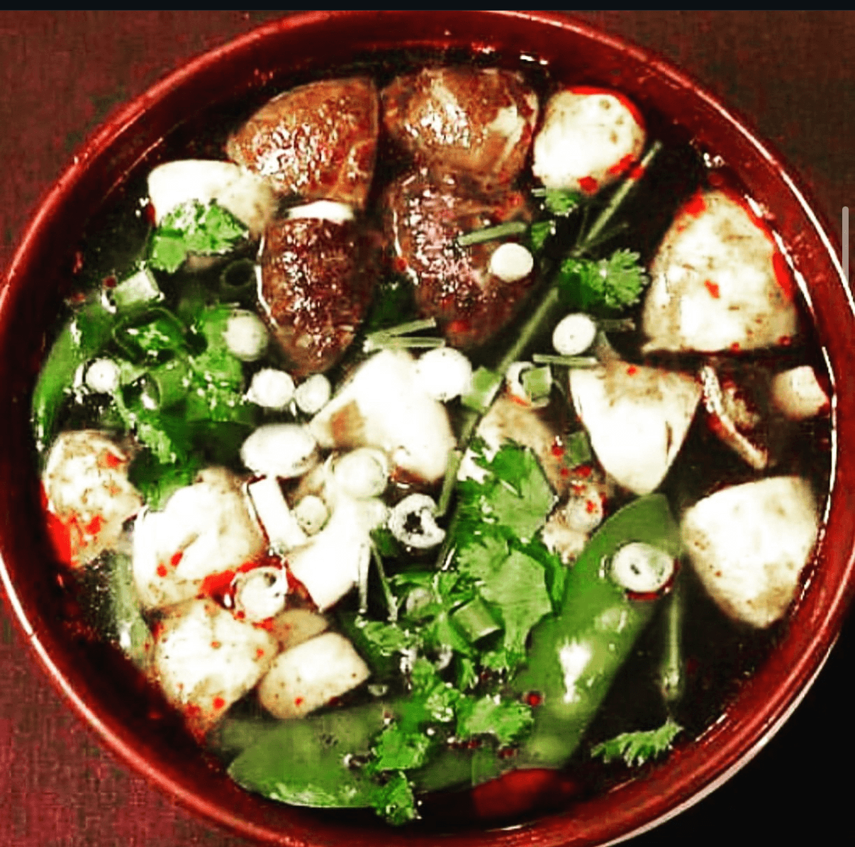 Thai hot & sour soup with mushroom in clear broth infused with lemongrass, kaffir lime leaves, cilantro, galanga ginger, and a touch of roasted curry.(GF)