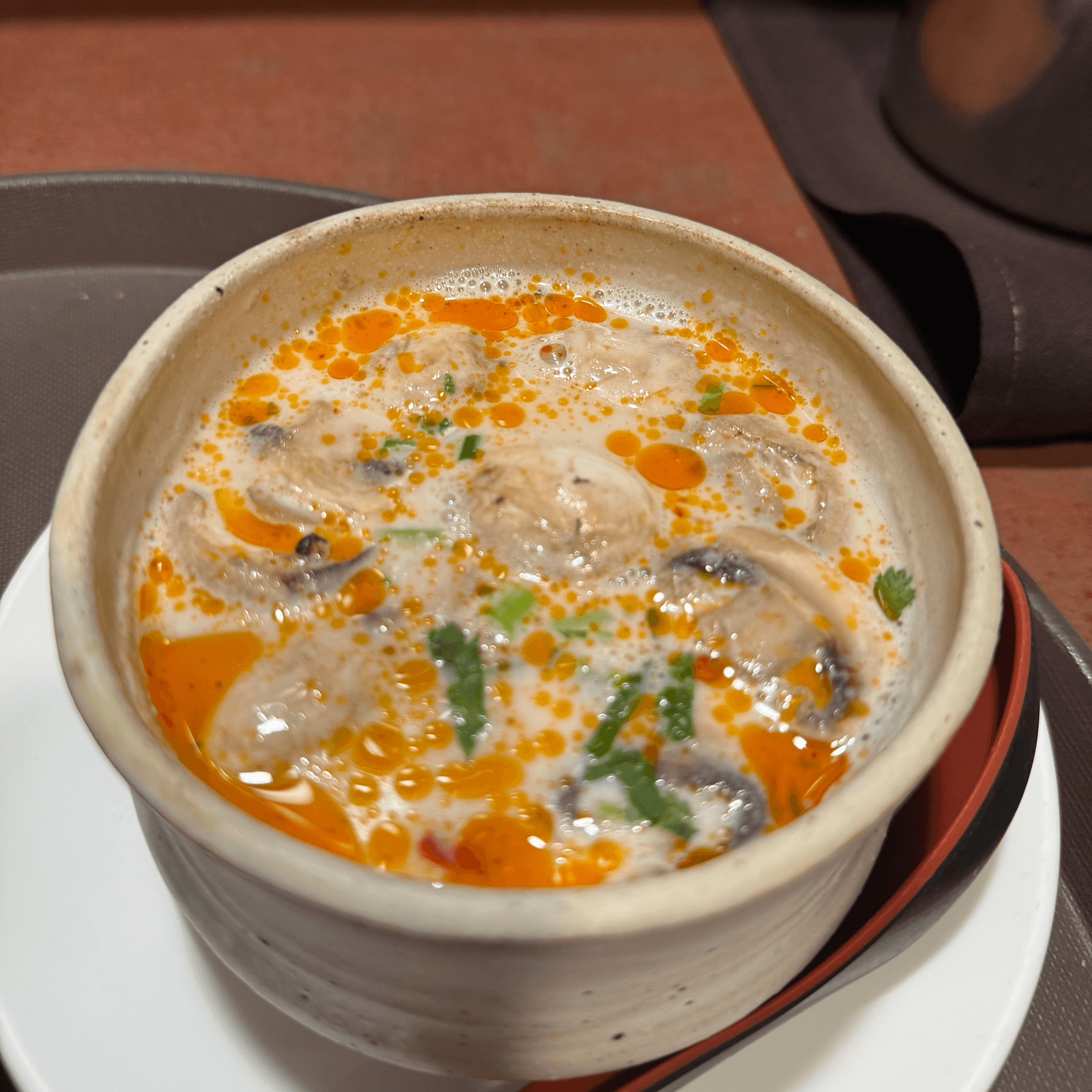 Thai coconut soup with mushroom in hot & sour broth infused with lemongrass, kaffir lime leaves, cilantro, galanga ginger, and a touch of roasted curry. (GF)
