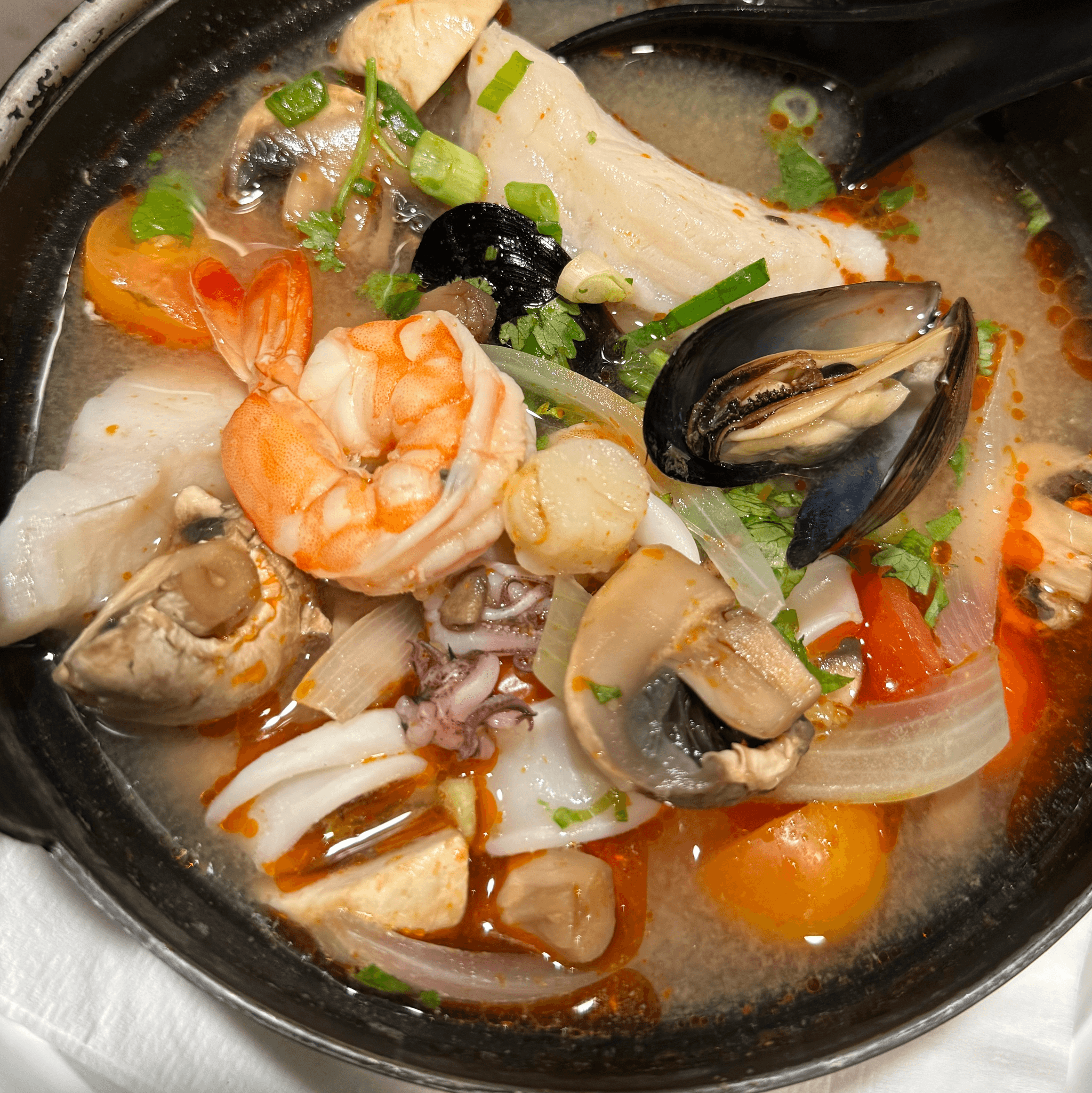 Thai Hot n Sour Soup with Prawns, scallops, mussels, calamari, fish fillet, onions, tomatoes and mushroom simmered in hot & sour broth infused with Thai herbs and roasted curry.