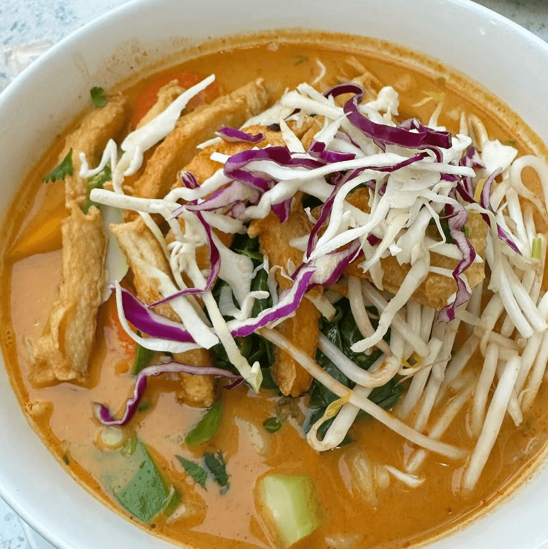Rice noodles in creamy coconut red curry broth with fried tofu, bamboo shoots, cabbage, bean sprout and Thai basil. (V) (GF)