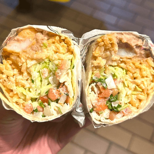 Refried beans, rice, cheese, sour cream, guacamole, and pico de gallo in a flour tortilla.