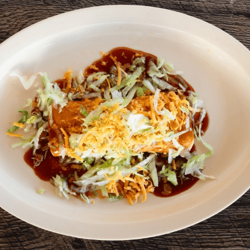 Two cheese enchiladas topped with crisp lettuce and covered in our rich enchilada sauce