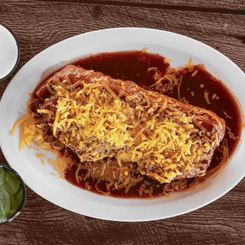 A juicy shredded beef burrito, topped with bell pepper, onions & tomatoes all wrapped in a soft flour tortilla served along side with a cheese enchilada thats covered in our rich enchilada sauce and crisp lettuce. Comes with a side of beans and rice